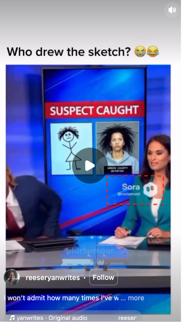 仔細查看圖片搜尋結果,發現不同帖文關於該事件的描述及部分細節有所不同。例如有一則Instagram帖文影片(「影片2」),儘管影片2的內容與網傳影片相近,但是主播身後的疑犯照片是一位女性,主播及播報場景也略有不同,該帖文的畫面有人工智能影片生成平台「Sora」的水印(如圖二所示),可知影片為生成式人工智能內容。另一則發布於Facebook平台的影片(「影片3」),影片3與被查核影片內容完全一致,但影片3的附文提及:「這不是由人工智能生成的內容,而是一則來自美國賓夕法尼亞州蘭卡斯特市,於2018年發生的真實新聞片段。當時,一張風格帶點卡通感的目擊者素描竟與嫌疑人極為相似,最終協助警方成功拘捕疑犯。主播們當時的反應也是真情流露,這段影片至今仍在網絡上廣泛流傳。」(This isn’t AI-generated. It’s a real 2018 news clip from a Lancaster, PA theft case where a cartoonish witness sketch hilariously matched the suspect, leading to an arrest. The anchors’ reactions are genuine, and it’s been viral ever since.)