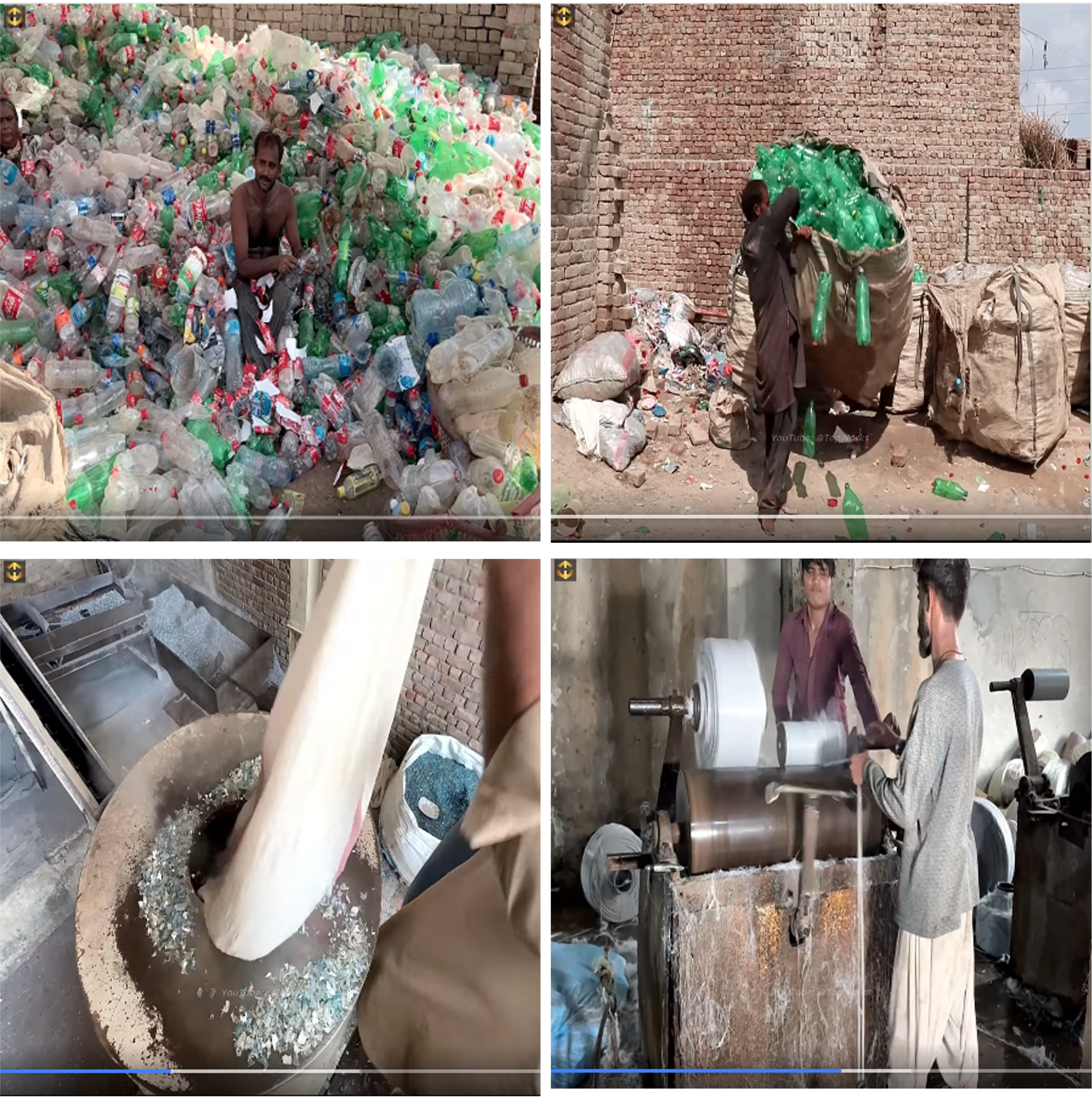 查核團隊於搜尋過程中發現,Facebook 用戶「Top Works」於2024年9月5日上傳一支影片((下稱「聚酯纖維影片」),配文為「工廠如何用百萬個廢棄膠樽來製造聚酯纖維」(How to make Polyester Fiber from Million Waste Plastic Bottles in Factory Process)。聚酯纖維影片中的若干場景均出現在網傳影片中,例如聚酯纖維影片中的23秒至46秒,對應網傳影片中的場景A(赤膊工人坐在膠樽裡去除標籤)和場景B(兩名工人搬運一大袋已去標籤的廢棄膠樽);聚酯纖維影片中的3分35秒至3分45秒對應網傳影片的場景C(米色長衫工人將碾碎的塑膠碎片倒入機器);聚酯纖維影片中的5分20秒至5分25秒則對應網傳影片的場景 D(兩名工人操作機器)。由此可見,該片段與製作牙線無關。