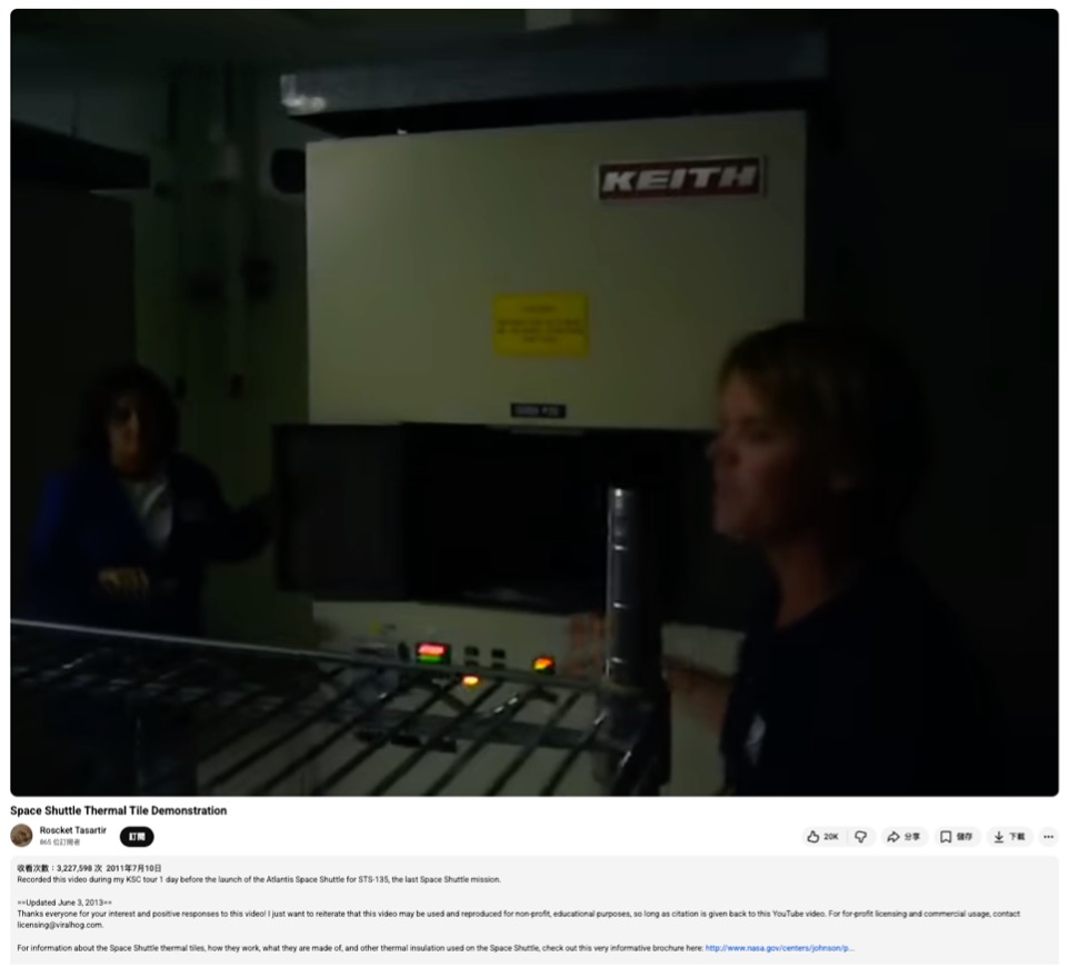 圖二:YouTube用戶「Rosket Tasartir」於2011年7月10日發布的影片,顯示在甘迺迪太空中心演示隔熱瓦特性。